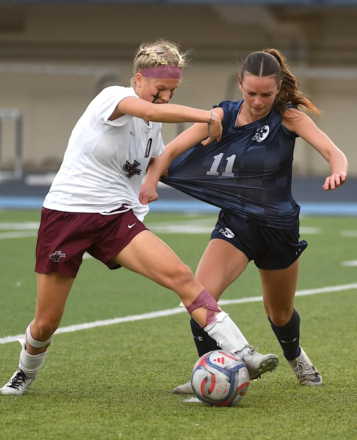 Bartlesville High School’s Leighton Sigler (11) battles for the ball with a Jenks player on March 31.Jenks defeated the Lady Bruins 7-0 on March 31 in Bartlesville. Next up, the Lady Bruins (3-2) hosts Westmoore Tuesday at 6 p.m.