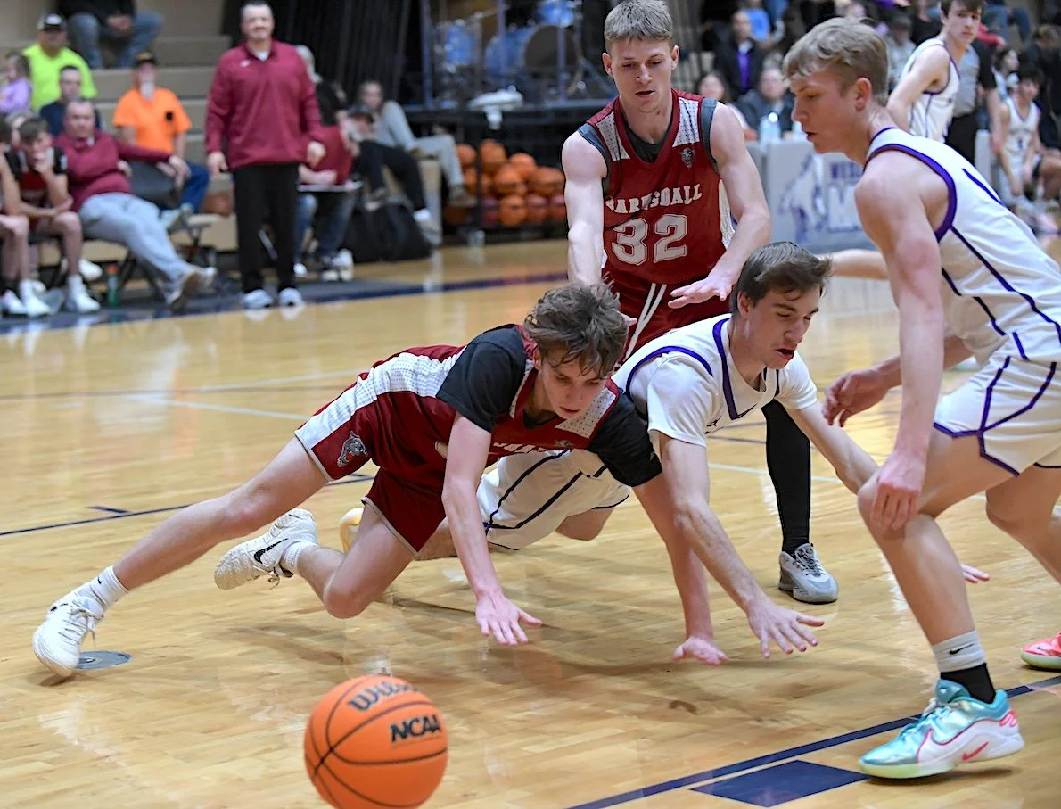 Barnsdall and Wesleyan Christian School players go after a loose ball during Tuesday’s game in Bartlesville. The Mustangs defeated Barnsdall 60-34.