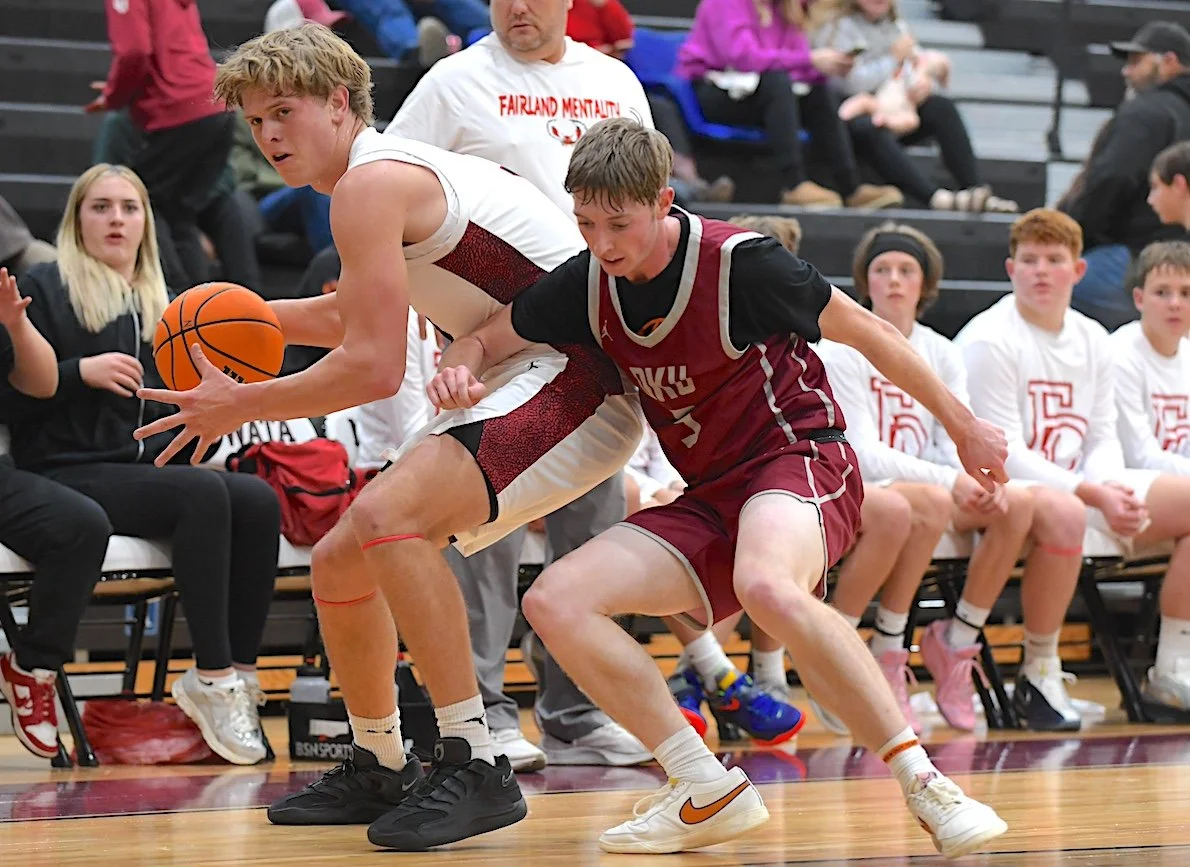 Oklahoma Union’s Jimmy Williams (5) fights for the ball against a Fairland player earlier in the week. OKU is playing in the Ty Hewitt Memorial Tournament in Nowata.