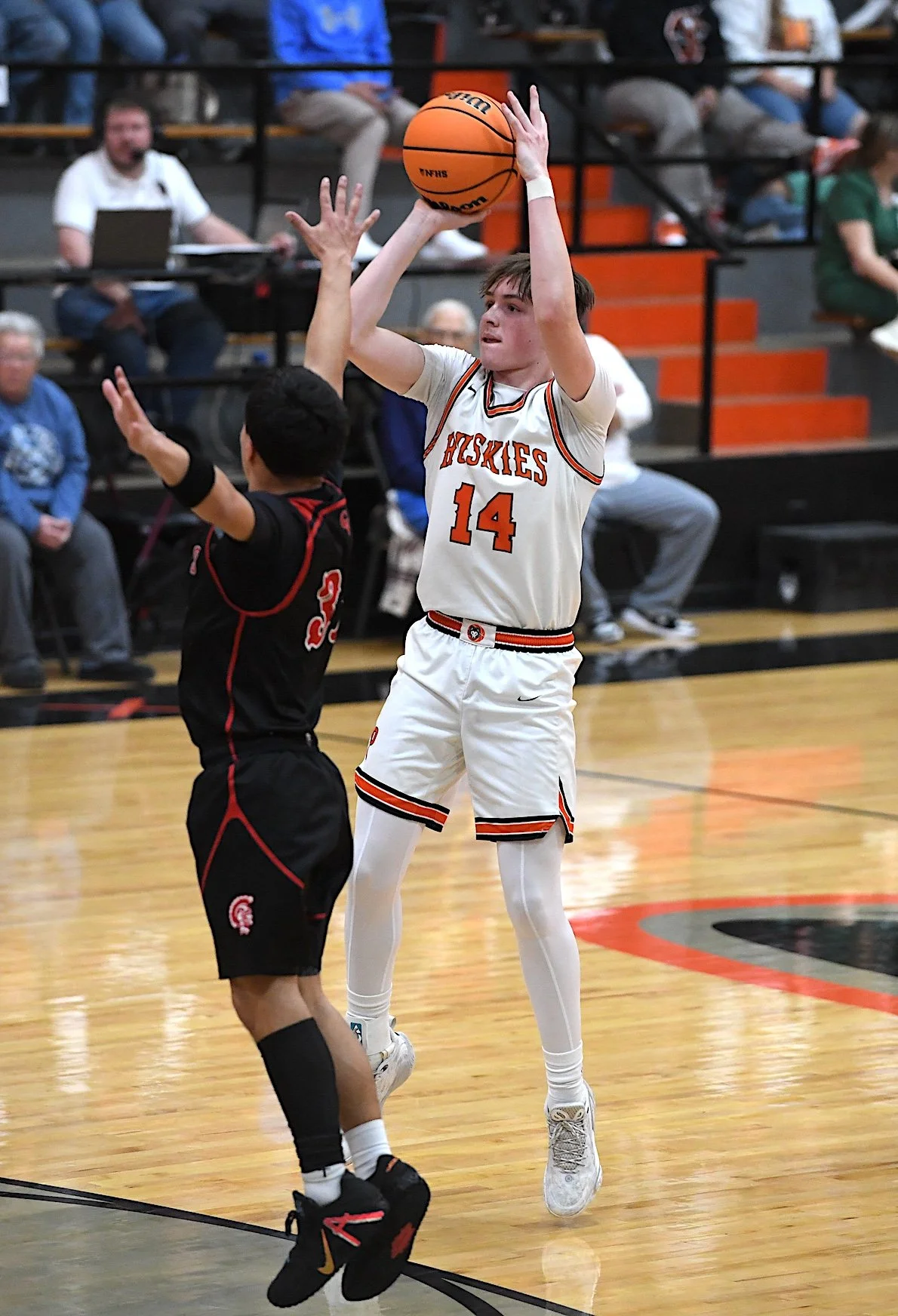 Pawhuska High School’s Jadon Spicer (14) shoots the ball over Caney Valley’s Preston Gipson (31) during regional playoff action in Pawhuska on Thursday. Pawhuska won 62-35.
