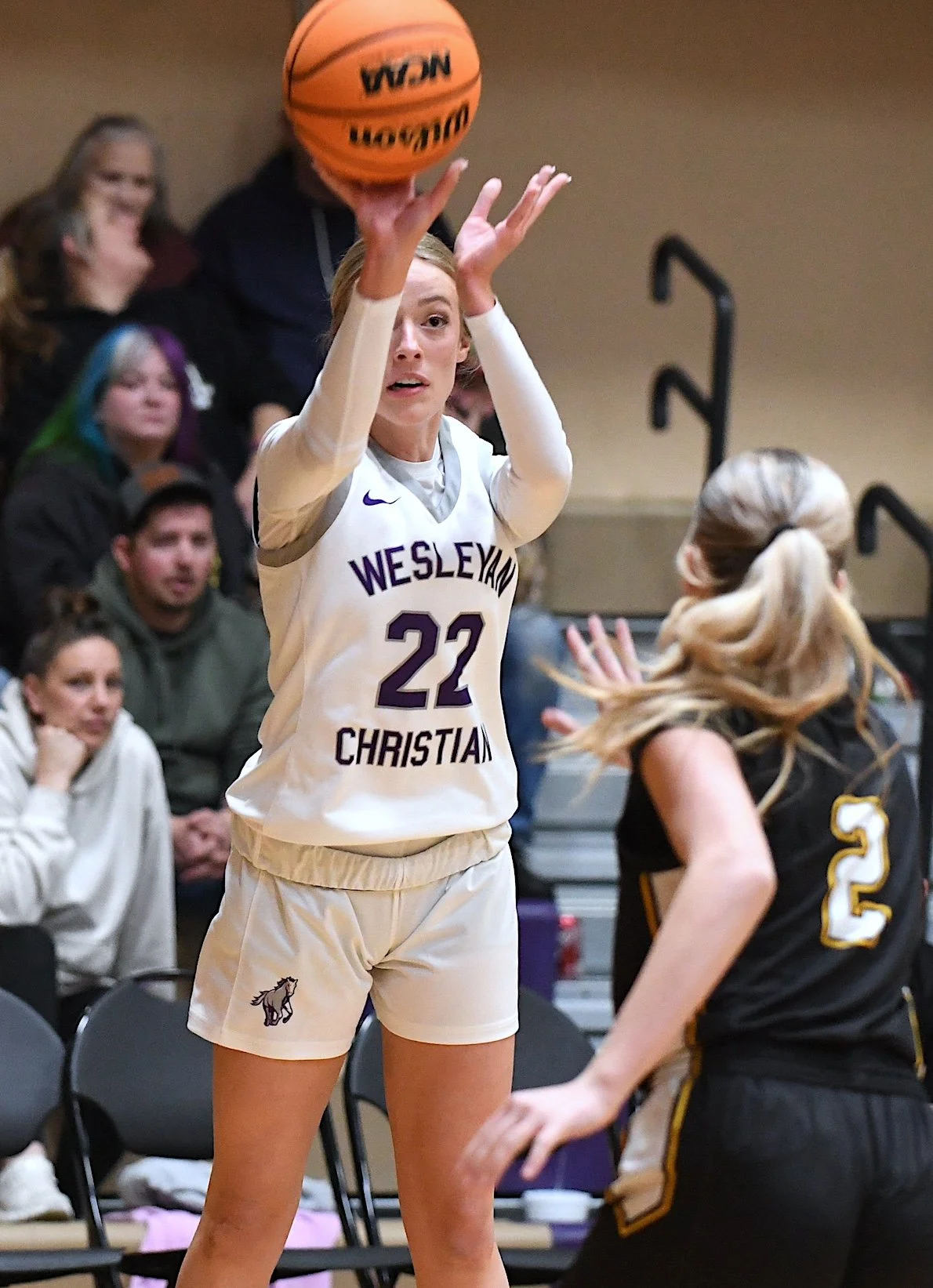 Wesleyan Christian School’s Whitlie Tennison (22) takes a shot against a Copan player in Bartlesville last Friday. The Lady Mustangs defeated WCS 60-20.