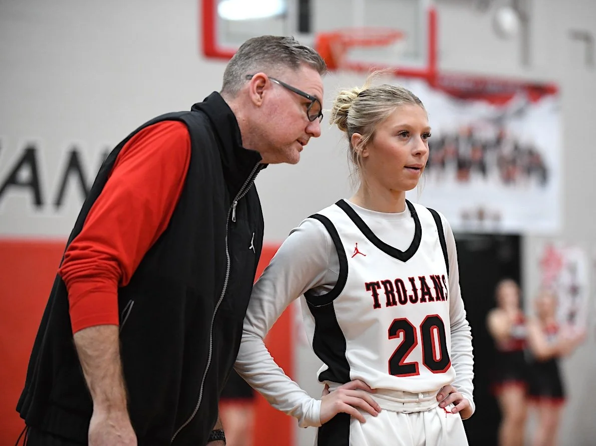 Caney Valley Lady Trojans head coach Derek Longan talks with Faith Davis (20) during an earlier season game. The Lady Trojans defeated Chelsea 54-26 in Ramona last Friday.