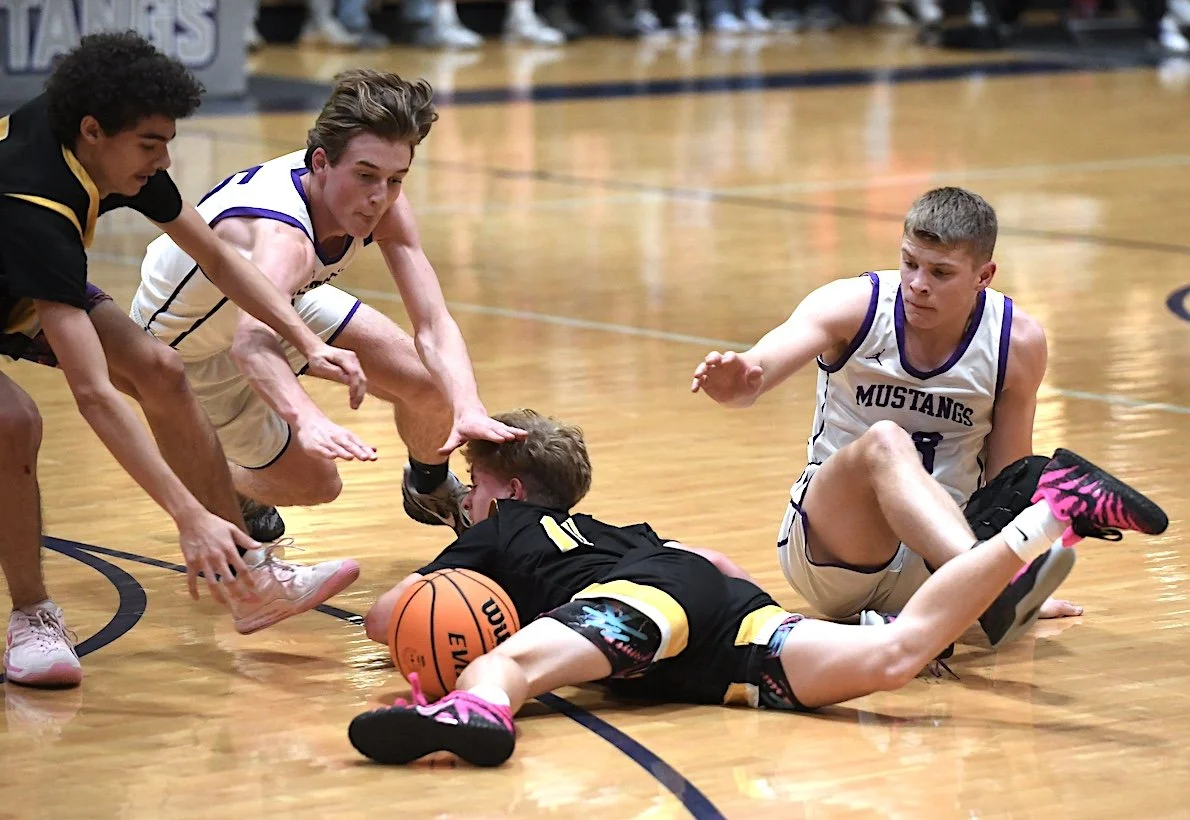 Wesleyan Christian School and Copan players fight for a loose ball in Bartlesville last Friday. The Mustangs defeated Copan 63-35.