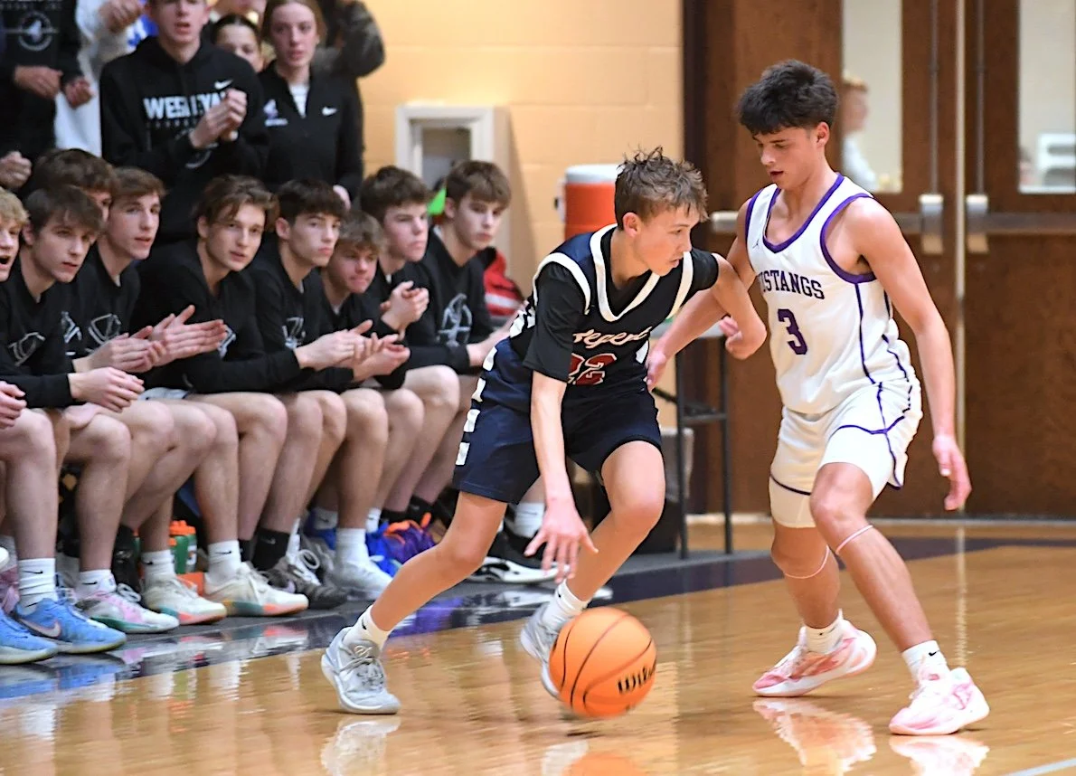 Wesleyan Christian’s Carter Kennard (3) guards a Regent Prep player as the WCS bench looks on last Friday in Bartlesville. WCS defeated Regent Prep 63-48.