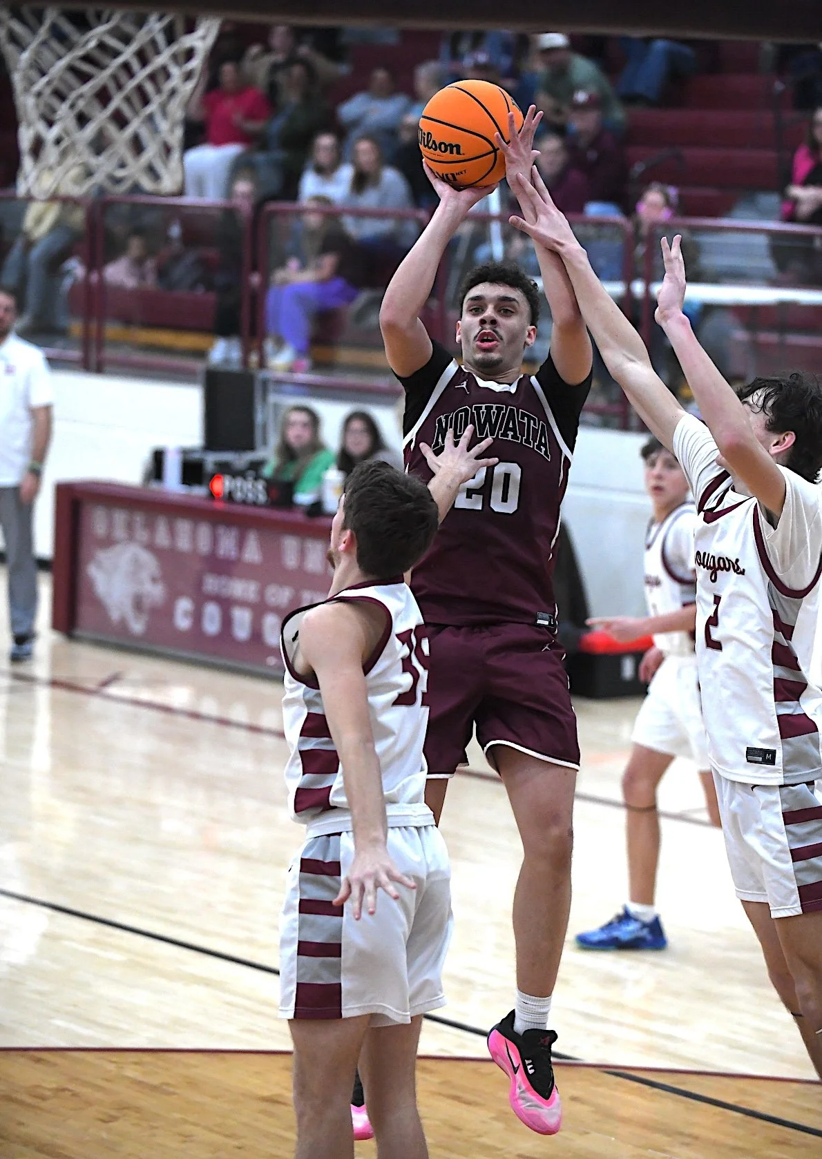 OKU (4-15) leading scorers were Aiden Talbott (16), Jensen Anderson (14), and Jimmy Williams (11). Nowata's Clint Harrington led all scorers with 28 points. Other Ironmen scorers included Talon Thompson (9), Brett Malone (8), and Ty Williams (7).