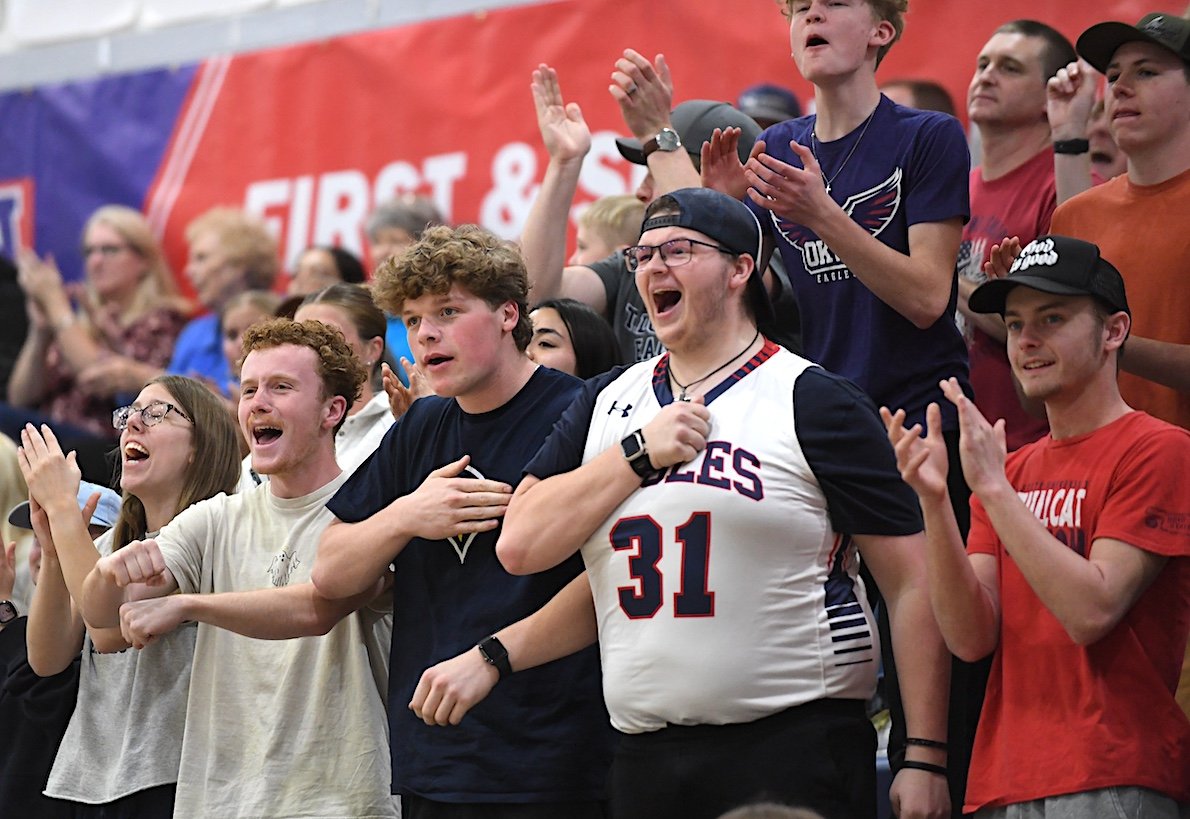 Oklahoma Wesleyan University fans cheer on the Eagles during the NAIA national basketball tournament first and second rounds over the weekend in Bartlesville.