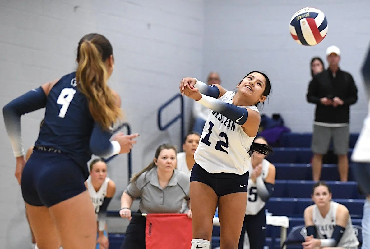 Oklahoma Wesleyan University’s Valeria Perez (12) passes the ball during a recent home match. The Lady Eagles opened the NAIA tournament with a win over Nelson (Texas) last week.