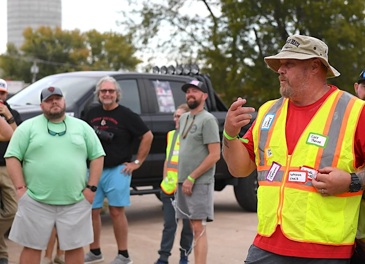 Dad’s Walk founder Dewayne Bryan, right, gives instructions to participants after they reach their first day's destination at the Rudd Motel in Nowata. Participants also stayed in the Gibson Motel.