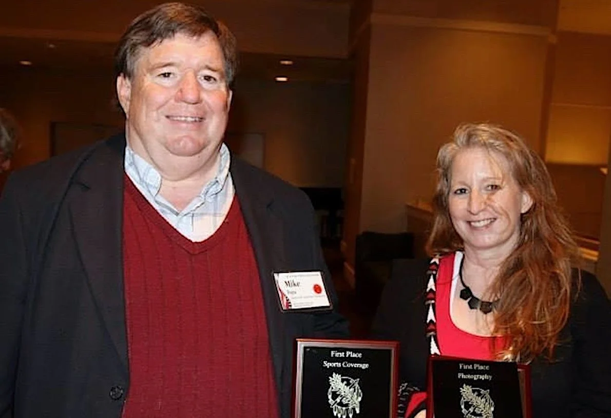 Recognized for his excellence, Mike was inducted into the Bartlesville Athletic Hall of Fame in 2019, honored by the Oklahoma Legislature, and named the 2023 Oklahoma Sportswriter of the Year. On April 12, 2026 — just five days after his death—Mike was posthumously honored with the Ray Soldan Award by the Oklahoma Basketball Coaches Association. This prestigious award is reserved for media members who demonstrate lifelong excellence in covering high school basketball in Oklahoma. He also won numerous state and regional awards for his columns, sports writing and sports photography.