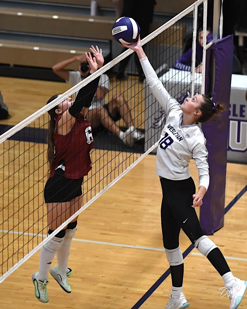 Energized by Emily Christensen’s high-voltage play, Wesleyan Christian School stunned visiting Oklahoma Union High School in girls’ volleyball action Tuesday, 3-0 (25-13, 25-18, 25-15).