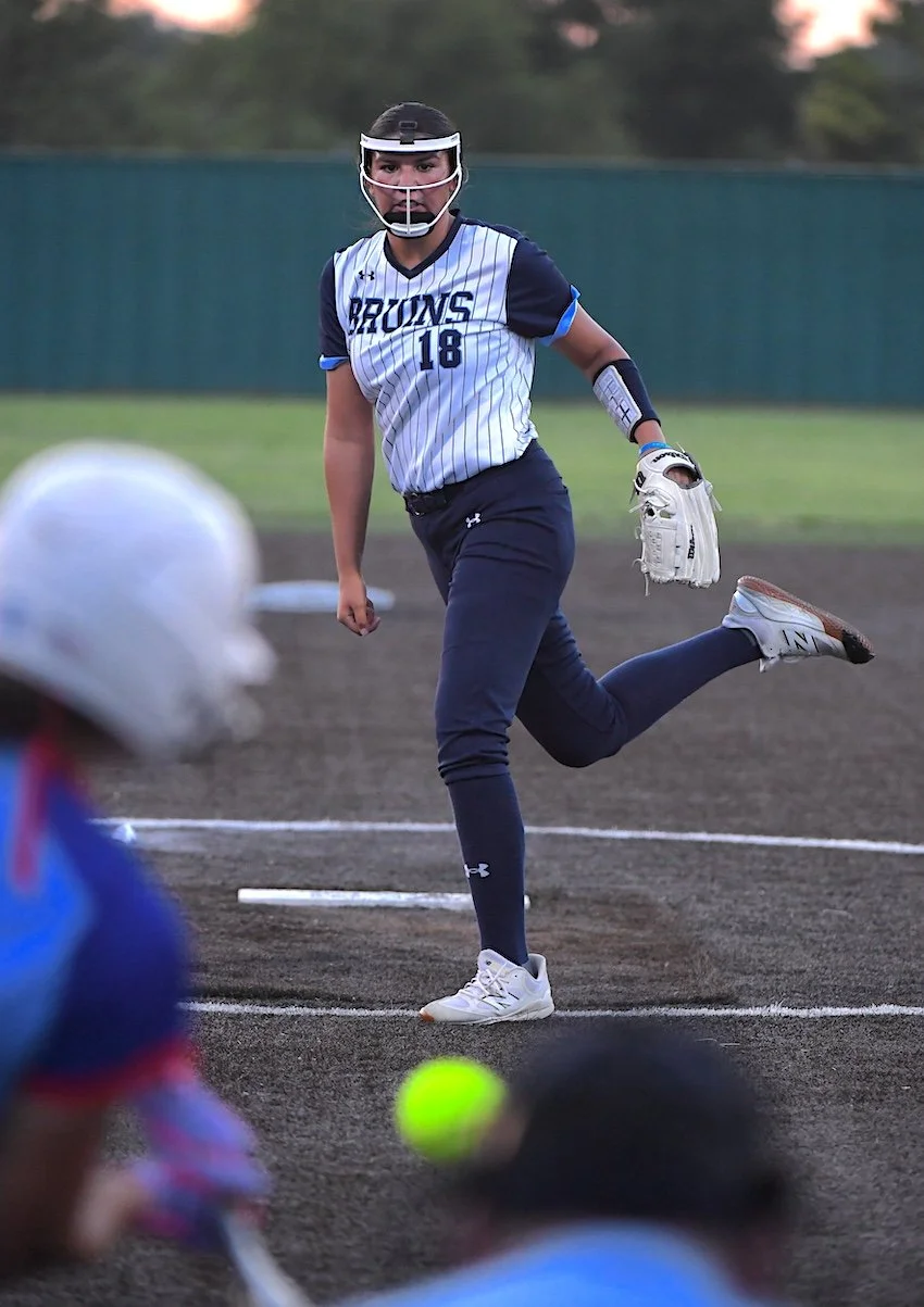 Bartlesville High School’s Kelsie Yales (18) delivers during the Lady Bruins home win over Bixby on Monday. Yales, who helped the Lady Bruins to their 12-2 victory, pitched her second complete game of the season.