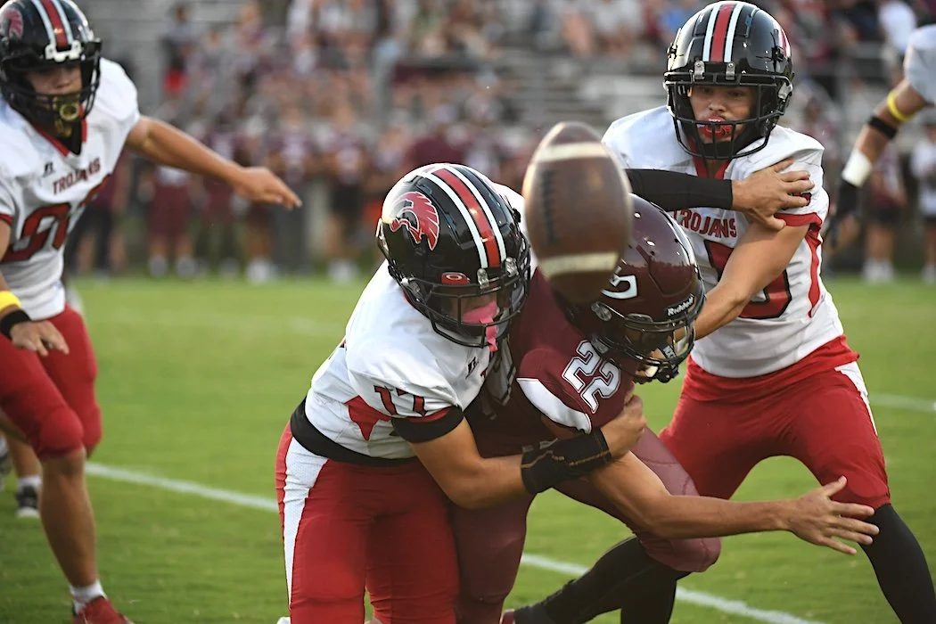 Caney Valley High School’s defense causes a fumble against Nowata last Friday. The visiting Trojans fell to Nowata 26-0 on the road on Friday.