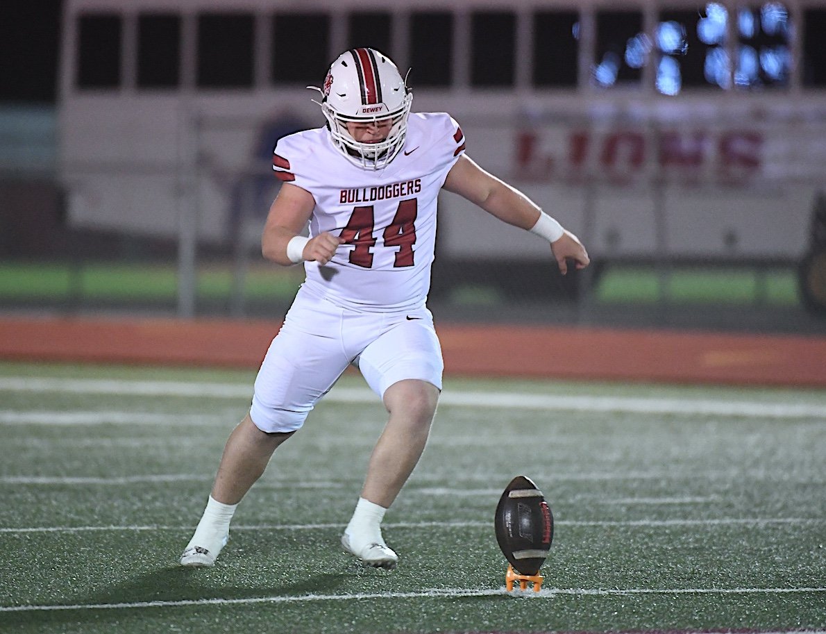Dewey High School’s Parker Garrison (44) kicks off on last Friday against Chandler. The Bulldoggers fell 38-7 during their final game of the season.