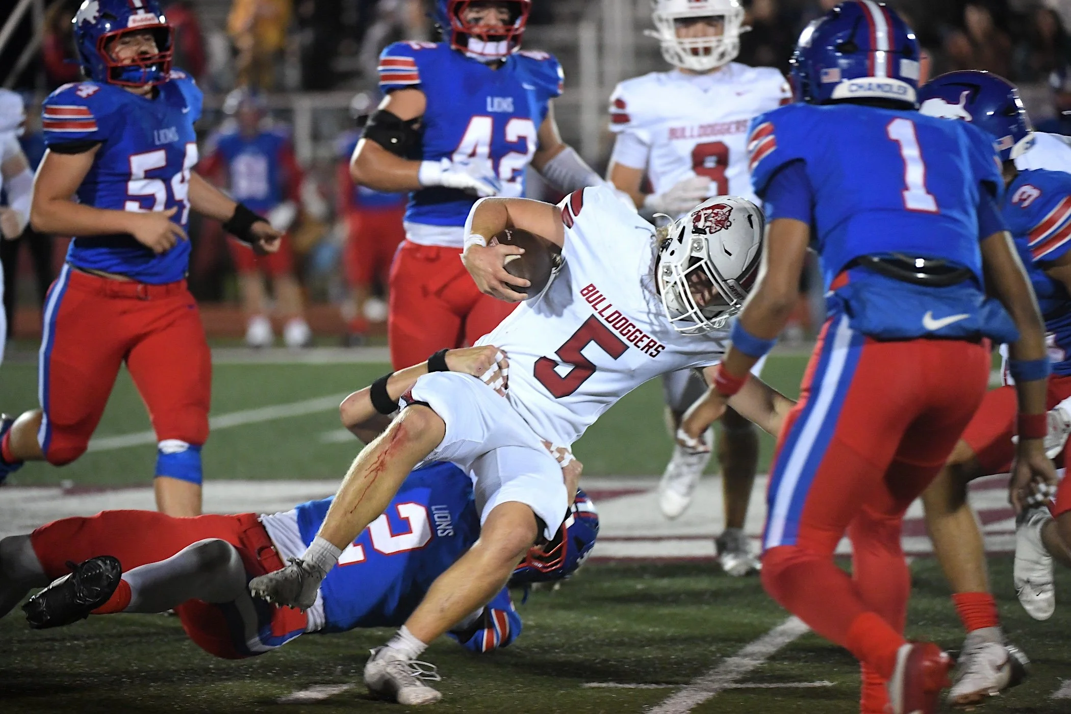 Dewey High School’s Eddie Rice (5) tries to break a tackle against Chandler last Friday. The Bulldoggers fell 38-7 during their final game of the season.