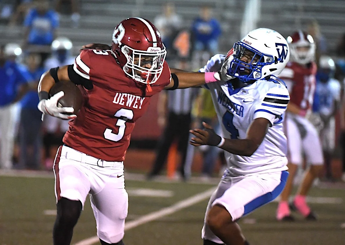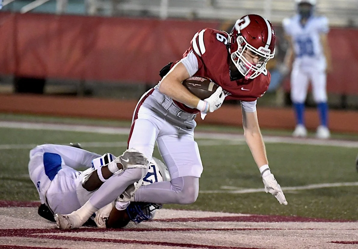Although he didn’t score, Jayden Vallen rumbled for 137 yards to spearhead Dewey’s rushing assault, followed by Rice with 86 and Davis with 75.