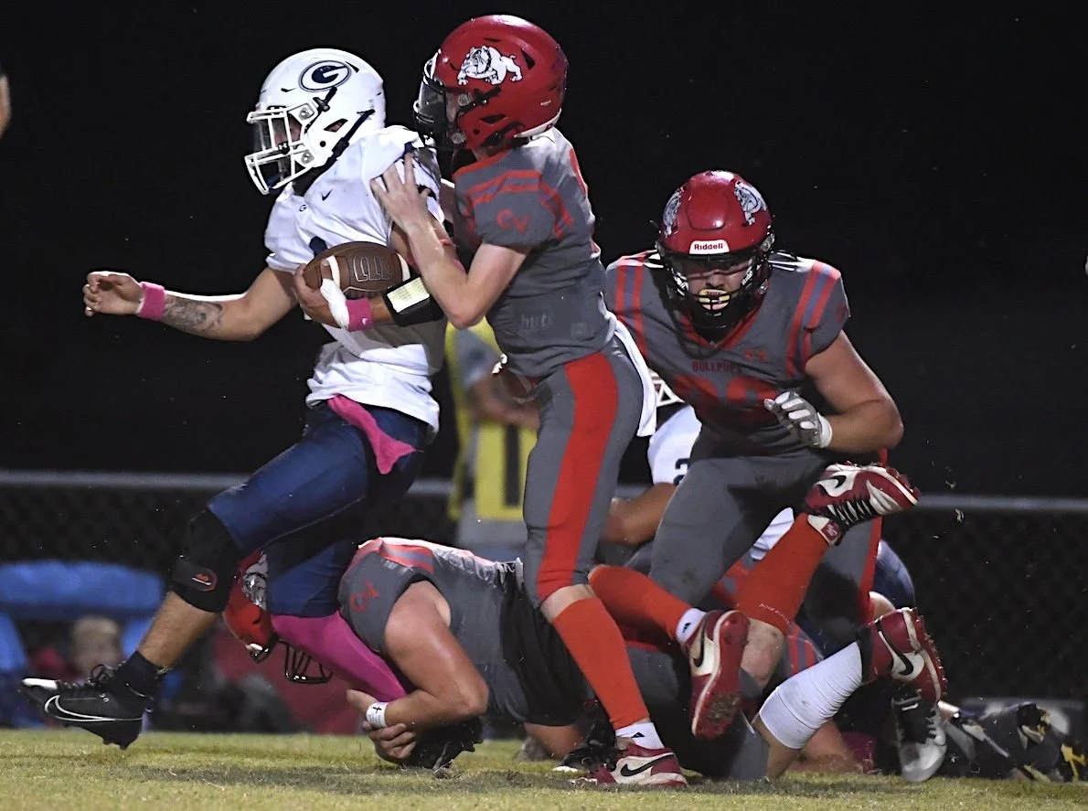 The Caney Valley (Kan.) Bullpup defense swarms a Galena runner during Friday night’s game in Caney. The Bullpups won 48-6.
