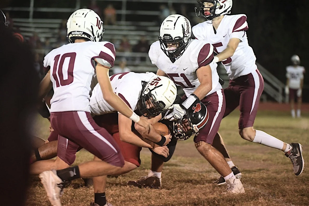 Oklahoma Union’s defense surrounds a Caney Valley Trojan runner during last Thursday’s game in Ramona. OKU defeated the Trojans 12-8.