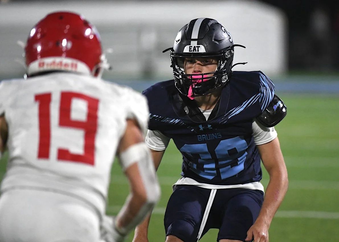 Bartlesville High School’s Cale Granger (39) eyes a receiver during an earlier season game. The Bruins host Muskogee for homecoming.