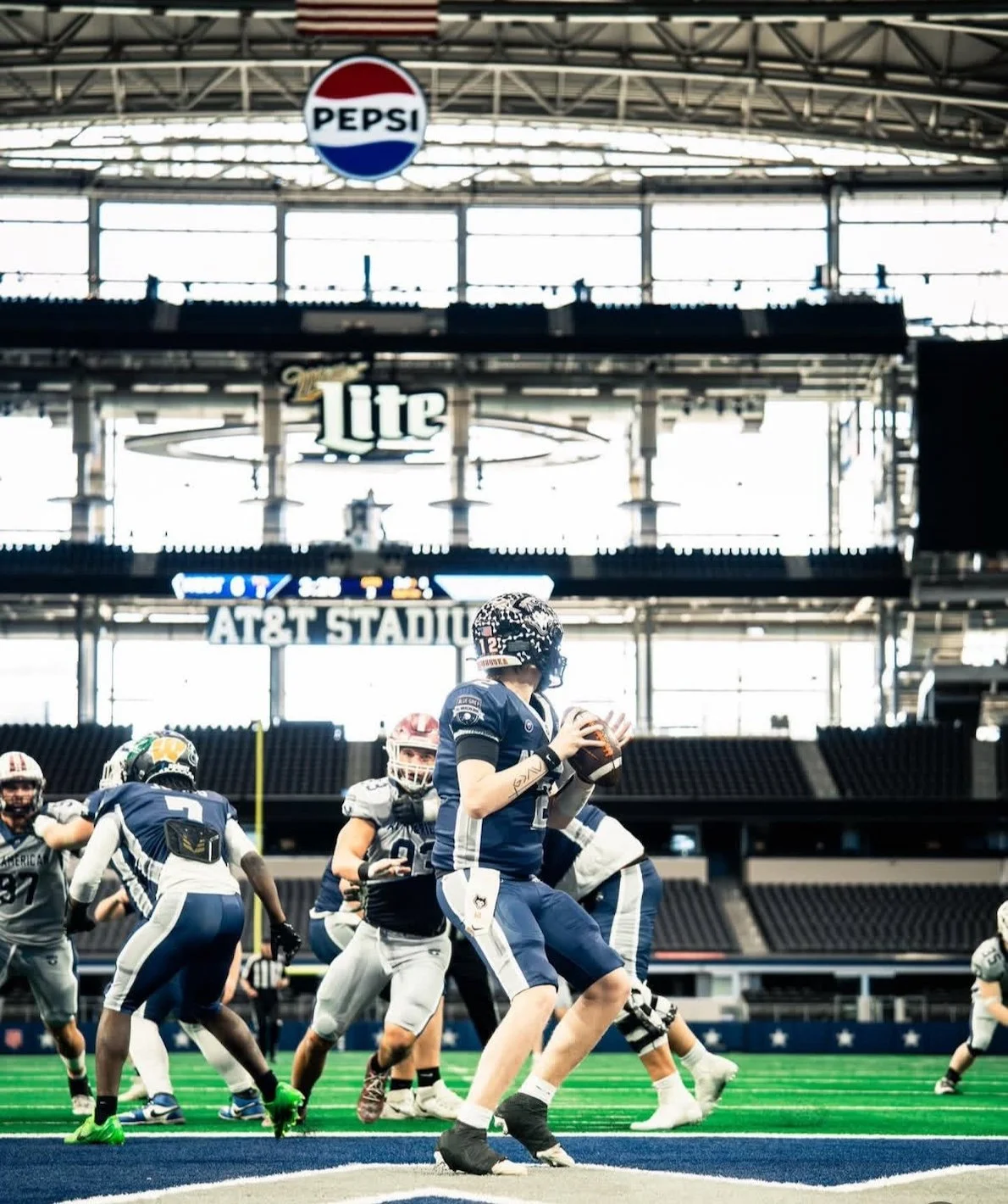 Pawhuska High School’s quarterback, Kane Foreman, passes the ball during the Blue-Gray All-American Bowl last Sunday held at the AT&T Stadium - the home of the Dallas Cowboys.