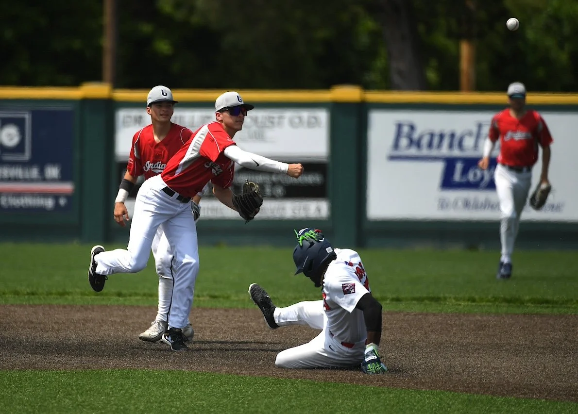 Bartlesville Doenges Toyota Indians shortstop Kael Siemers turns a double play with the help of second baseman Bryce Luelf against Dallas-Fort Worth on Saturday at Bill Doenges Memorial Stadium. The Indians had a rough start against college-experienced teams, going 0-4 early in the season. They play a double header tonight at 5:45 p.m. at home.